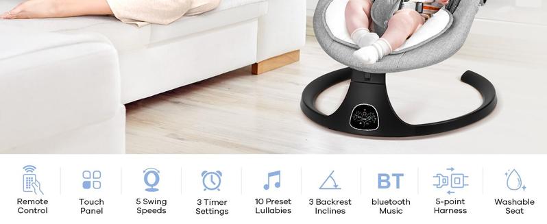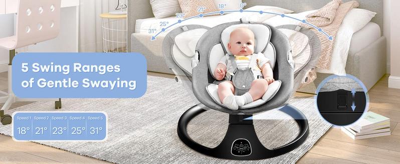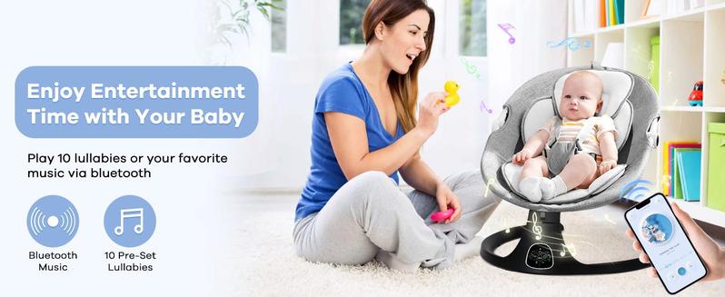 - 3 speeds and 8 lullabies can soothe your baby. Thesound volume of the lullabies is adjustable. Remove thetransparent sheet of the remote control before use.3 Adjustable Backrest Inclines. You can choose theappropriate incline according to the degree of baby'sspine development. When the minimum incline is set. thebaby will not sag when lying on it. so it will not hurt thespine of the newborn.