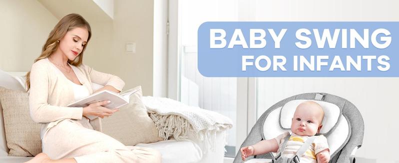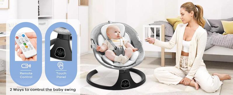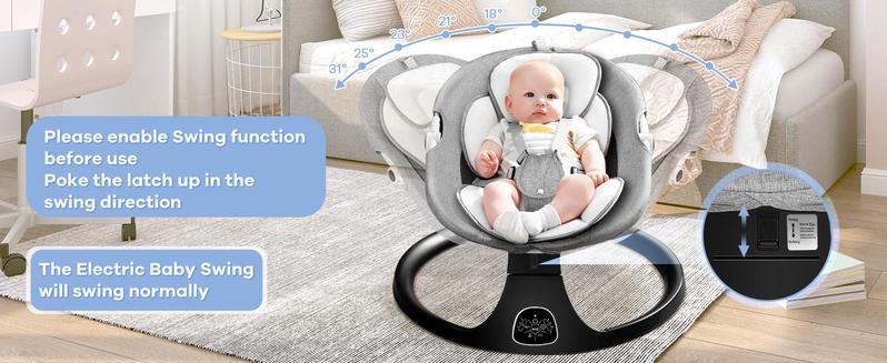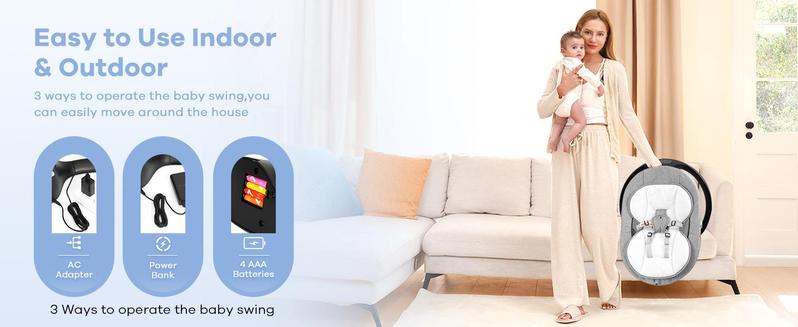 - Two Toys and Mosquito Net. There are two toys onthe top of infant swing to attract baby's attention.Mosquito nets keep babies away from mosquitoesIndoor and Outdoor Use. The swing for baby can beplugged in for use indoors and battery powered whenoutdoors. The sturdy structure prevents the baby swingand bouncer from tipping when used indoors andoutdoors.