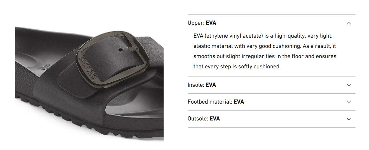 • This is a new and modern interpretation of theBIRKENSTOCK classic Madrid. This version featuresour popular Big Buckle made from a stainlesssynthetic material and makes an impression with itsdurability and minimalist design. Modeled on thecork sandal, it is made from the ultra-lightweightand highly flexible synthetic material EVA. The highquality, odor-neutral EVA has been tested forharmful substances and combines numerouspositive attributes: it is very light, highly elasticshock-absorbent,water-resistant, and skin-friendly.