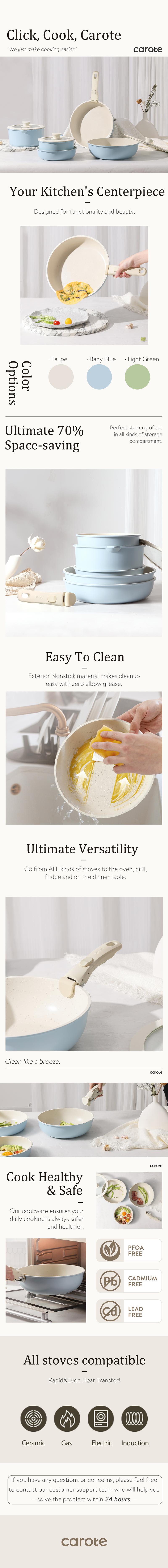 • CAROTE 18pcs Detachable Handle Nonstick Cookware Set, Blue/Green/Black/Taupe/White, Pots and Pans, Oven safe Frying Pan, Dishwasher Safe
