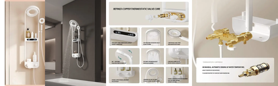 Indulge in the opulent experience of the RUVEL Spiral shower panel, meticulously designed to transcend your daily shower routine into a luxurious spa-like retreat. Let the overhead rain shower envelop you in a cascade of refreshing water, while the invigorating mist spray revitalizes your senses. The soothing hand shower, with its rainfall and mist spray settings, offers a personalized and indulgent experience. The ambient LED lighting, with its striking blue-tinted glow, sets the perfect mood for relaxation, and the modern digital display adds a touch of elegance to your shower space. Effortlessly control the temperature with the user-friendly diverter knob, ensuring a customized and refreshing shower every time. The innovative design of the panel not only provides ample storage for your shower essentials but also exudes modern sophistication. Keep track of the temperature and shower duration with the digital display, adding a dash of contemporary flair to your shower routine. The versatile 360-degree rotating shower head offers a choice between a gentle rain shower and a revitalizing mist spray, allowing you to tailor your shower experience to your preferences. When it's time to unwind, seamlessly transition to a relaxing bath with the built-in tub spout, completing your luxurious shower-to-bath experience.